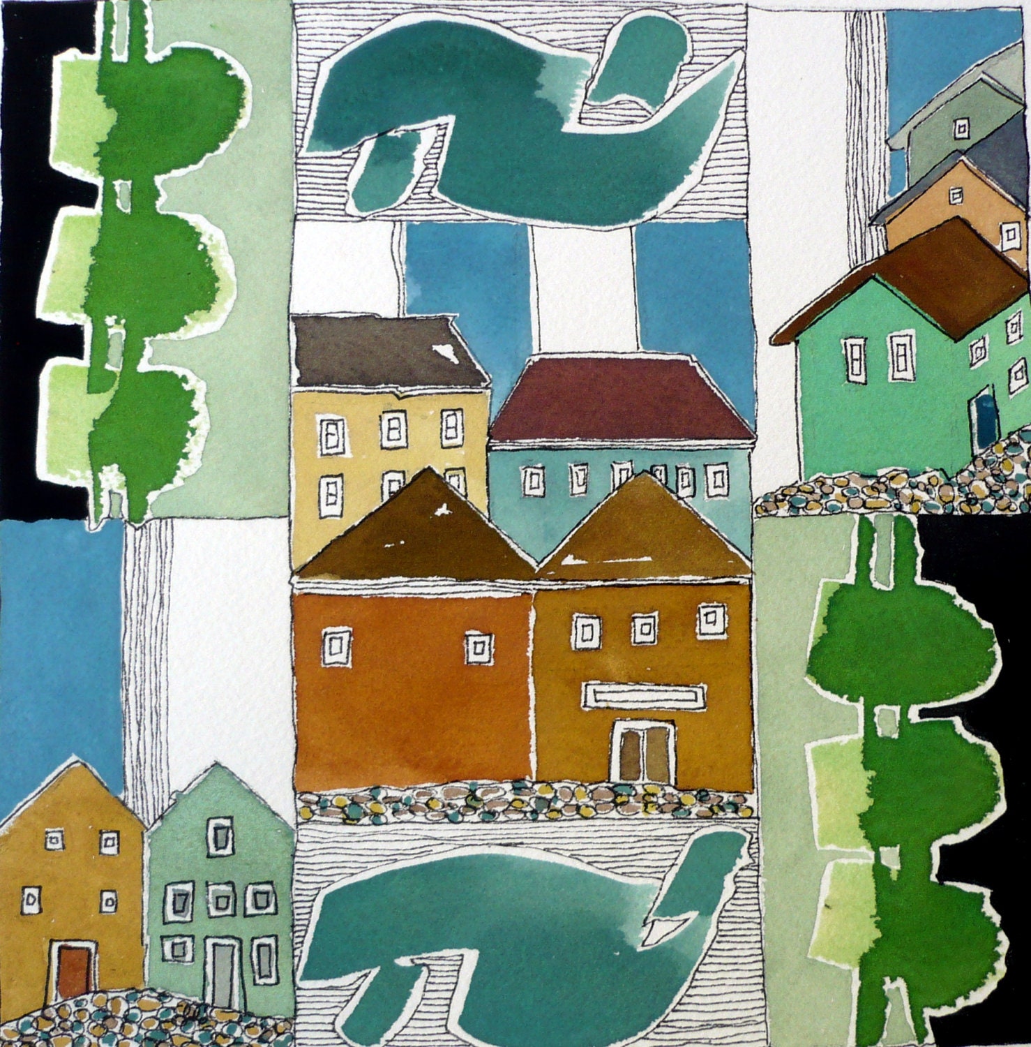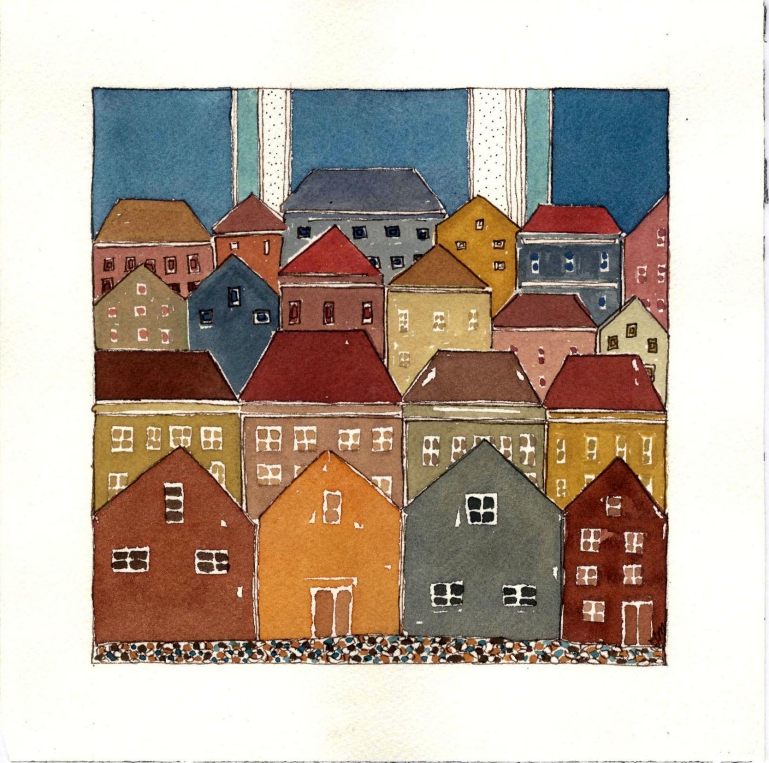 Original Art "Sea Breeze Houses." Original Watercolor Painting from BlueMagpieDesign - Portugal |