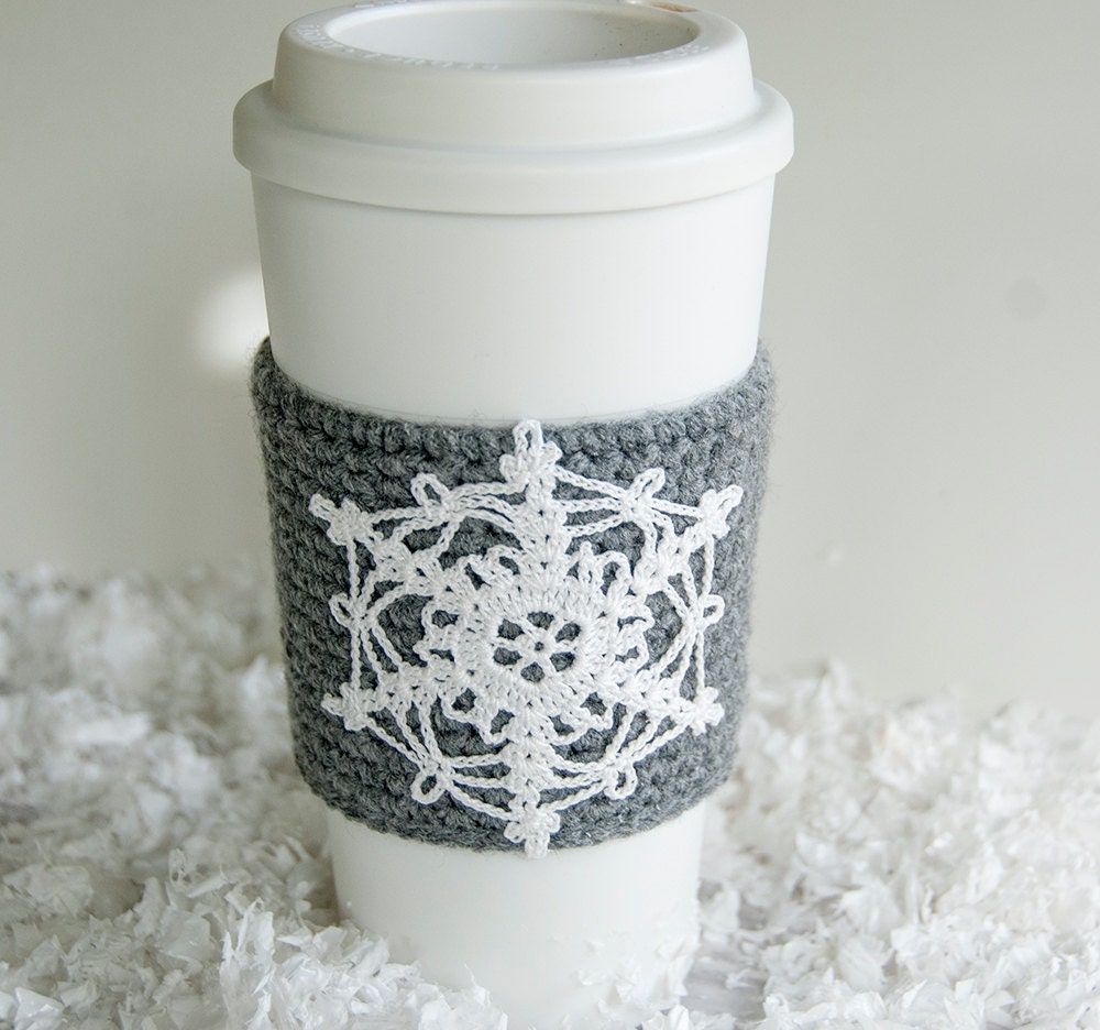 Coffee cozy, crochet appliqued snowflake from TableTopJewels |