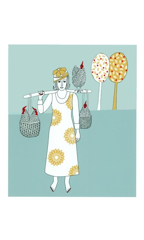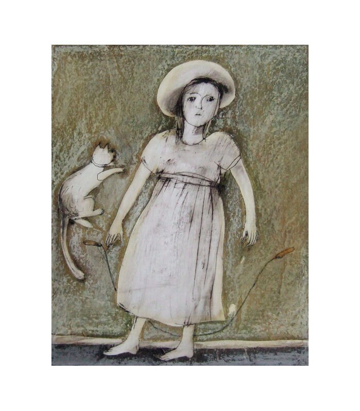 Art Print figurative, GIRL with CAT, paper 8.5" x 11" by marina826 |